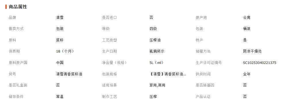 滇雪清香菜籽油5L装家用物理压榨食用油非转基因家用商用植物油