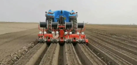 新模式由原来的手推机械单垄2行播种变成无人化作业4垄8行播种,每小时作业面积可以达到10亩以上,作业效率是原来模式的4倍以上,且播种深度一致,有利于后期无人化机械采收。