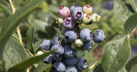 根据品种、用途和市场需求确定采收时间:鲜食蓝莓宜在果实完全成熟后采收,此时果皮呈深紫色或蓝黑色,覆有白霜,果实柔软多汁;用于加工的蓝莓在果实八九成熟时采收,此时果皮为浅蓝色或浅紫色,颜色较浅,手感较硬,有一定弹性。蓝莓果实较小,需人工采摘。采收时,用手轻轻捏住果实,从果柄处摘下放入容器,避免损伤果实和果柄,影响品质和贮藏期。