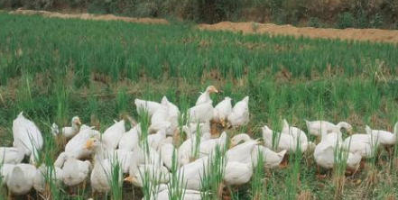 21日龄后:开始放牧觅食,但早晚还是要补喂精料。我家鹅场边种了黑麦草,小鹅可以随时吃到新鲜牧草。