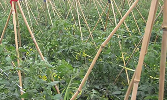 ② 搭架、绑蔓 随植株生长和果实膨大,及时搭架、绑蔓,以防倒伏。 植株第 1 花穗果实膨大、第2 花穗开花时,可搭架绑蔓。 搭架方式主要有篱笆架及“人”字架两种,搭篱笆架的,植株生长后期通风透光条件较好。 插架后绑蔓,每 2 穗花绑 1 次蔓。