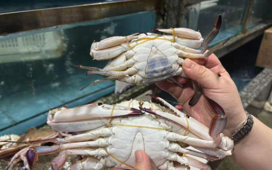 “将蟹壳翻面,从其腹部便能识别。三角形脐部区域洁白为大白蟹,如颜色发黄偏深则为三角蟹。”君君告诉劳动报记者,选蟹时,不单要用肉眼观察其外观是否完整,还可适当用手按一按其腹部和四肢,如无“空鼓”现象则说明螃蟹肥美、肉质紧实。反之则较为瘦弱。