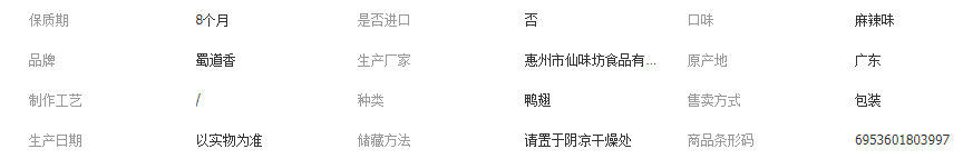 麻辣鸭翅:35g/包,180包/箱;