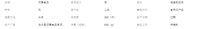 临沭县顺康食品有限公司是46碎肉、板油、槽头、寸排、肥膘、龟肉、块肉、肋排、前健、前排、去筋膜三号肉、五花条、猪蹄、猪头等产品生产加工的公司,拥有完整、科学的质量管理体系。临沭县顺康食品有限公司的诚信、实力和产品质量获得业界的认可。欢迎各界朋友莅临参观、指导和业务洽谈。