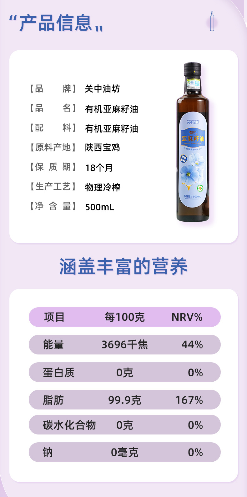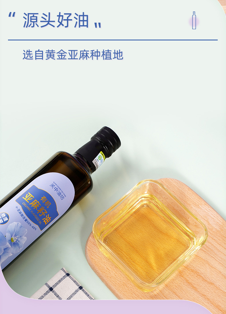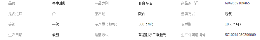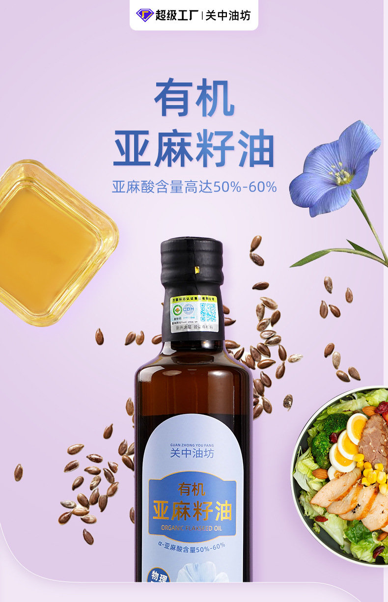 陕西关中油坊油脂有限公司发布的【整箱批发价】有机亚麻籽油500ml×20瓶一级物理压榨冷烹两用油图集库