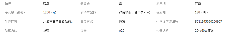 北海市回头客食品有限公司发布的20枚装 恋潮牌海鸭蛋 北海红树林散养鸭蛋(60g/枚) 咸鸭蛋包邮图集库