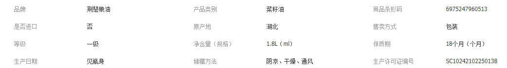 湖北省粮油集团(武汉)有限公司发布的荆楚粮油皇鄂娘一级优质菜籽油1.8L物理压榨 非转基因食用油家用图集库
