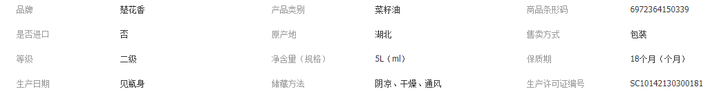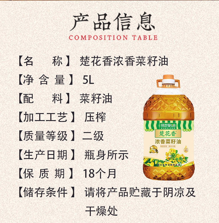 湖北省粮油集团(武汉)有限公司发布的荆楚粮油楚花香浓香菜籽油5L非转基因压榨健康营养家用食用油5升图集库