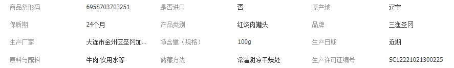 大连市金州区圣冈水产品加工厂发布的三渔圣冈红烧牛肉罐头100g熟食即食方便速食商用批发快餐食品图集库