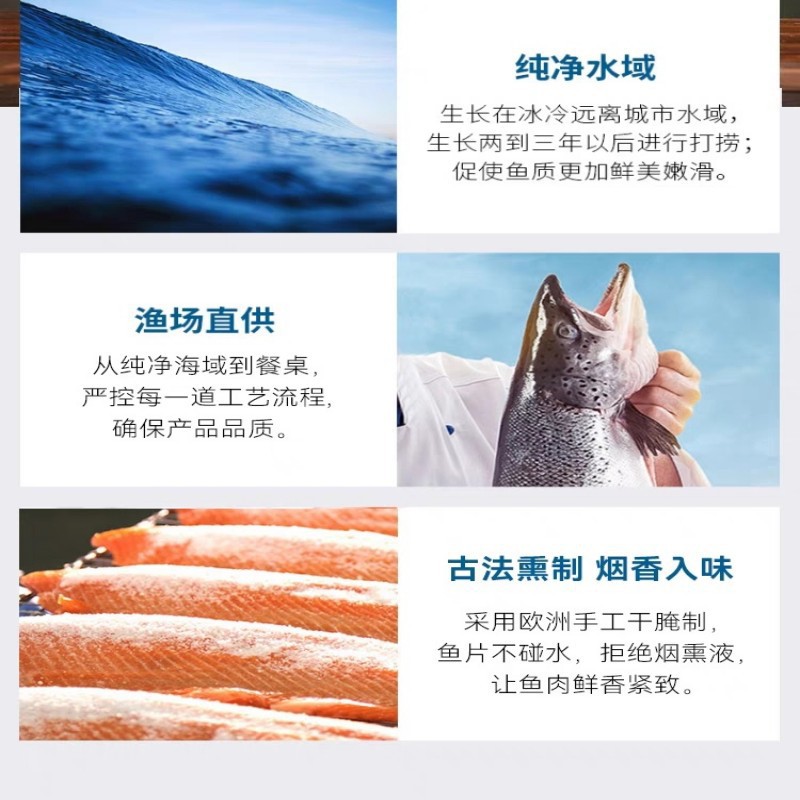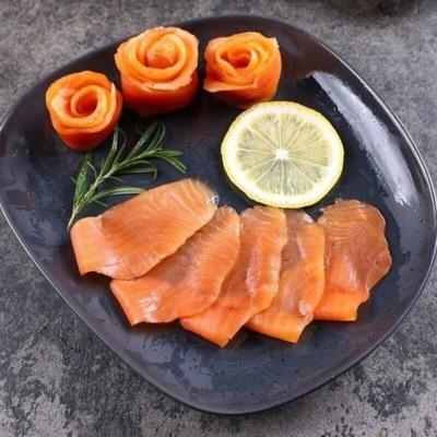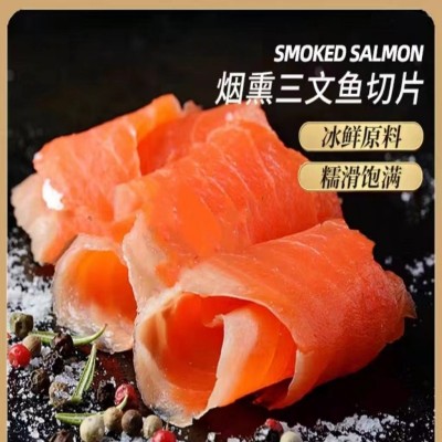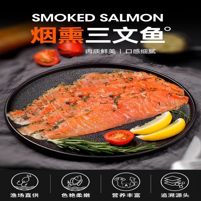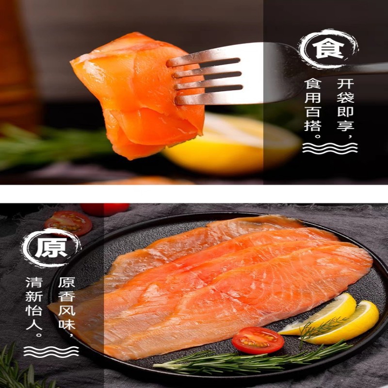 福山区君选优鲜供应链商行发布的包邮烟熏三文鱼即食170g/袋日料健身代餐刺身拼盘腌制生鱼片刺身图集库