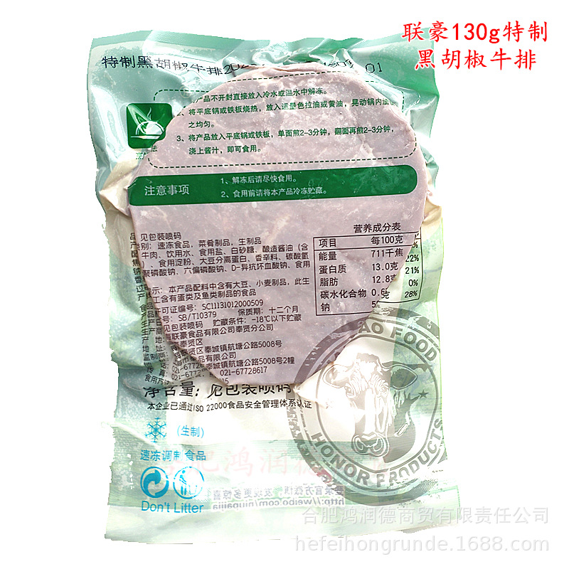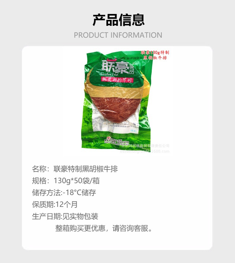 2.本品联豪130g特制黑胡椒牛排品质好,适合家庭牛排、西餐牛排店、咖啡店、中高档西餐厅等客户,量大更优惠,需要量大下单请联系客服。