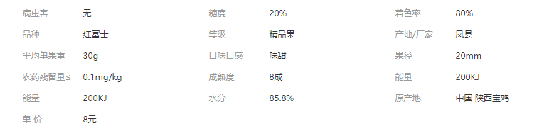 西部优质绿色农产品供应商凤县气候适宜苹果生长,果品质量好,是省级优质果品基地。苹果是凤县优势产业之一,品种繁多,有红富士、新红星、秦冠等品种,其中新红星、红富士获省优称号。凤县独特的自然条件优势决定了苹果的优秀品质,这里海拔高、昼夜温差大,环境无污染,所产苹果果面清洁、蜡质厚、着色鲜艳、硬度大、含糖量高、耐贮藏、货架期长。已建成以凤州、平木、唐藏、双石铺为中心的苹果生产基地,年产苹果4万吨。