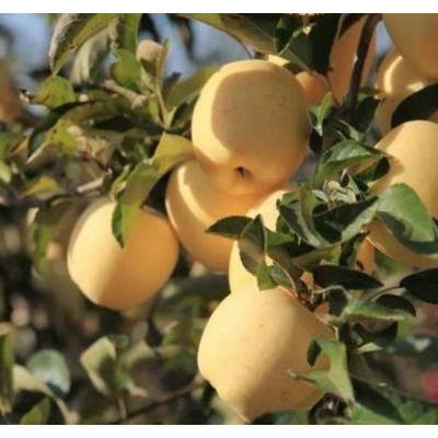 维纳斯黄金苹果是由日本专家在金冠苹果的自然杂交后代中选育得到.威海金苹果无袋栽培果实呈绿色,进入成熟期后逐渐变为黄绿色或金黄色;套袋栽培的果实在摘袋后,部分果实阳面生有一层红色晕,其他部位为金黄色;不摘袋的果实则通体为金黄色。威海金苹果果面平滑,皮孔少且小,果顶通常有五棱或六棱突起。果实硬度较大,果汁丰富,果肉为淡黄色,果香浓郁,口感脆甜。每年10月下旬至11月上旬开始采收,贮藏性较好,常温可贮藏3个月以上。威海金苹果的综合品质高、适应性广、抗逆性强,是一种非常有发展潜力和推广前景的新品种。胶东地区阳历10月下旬成熟,平均单果重240克左右,大果重320克。果型高桩,果面黄色,有蜡质光泽,无果锈,果肉淡黄色。肉质酥脆爽口,多汁液,酸甜适口,可溶性固形物含量14.5%–15.5%,糖度16.3%Brix。该品种套袋果实比不套袋大,在观察中,无袋栽培果实阳光面浅红,果肉黄色不发绵,耐贮运。在常温下可储存至来年3月,冷库贮藏与富士相同。10月中旬后达到可食采摘期,11月上旬采收风味浓郁。