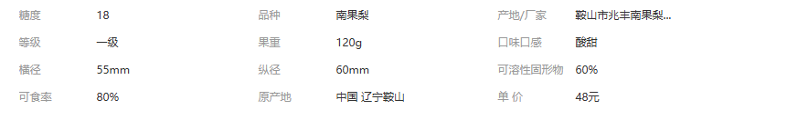 果实扁圆形到近球形。一般纵径为4.7-5.2厘米,横径为5.5-5.8厘米。平均单果重50-75克左右,单果重可达170克。果皮中厚,较韧,表面不很光亮,底色多为黄绿色,阳面带有红晕,色泽鲜艳美观。果点较大,近圆形,分布不均。果梗短粗,果心较小,果肉乳白色。果实采收后,果肉稍硬,甜脆可食,经10-15天后熟,果肉变黄白色,肉质细,柔软多汁,石细胞少;果皮薄,甜酸适度,芳香浓厚,易溶于口,品质极上。