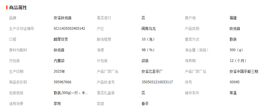 【产品说明】选用品质优良的铁观音茶青成叶加工制成,条索匀整重实。