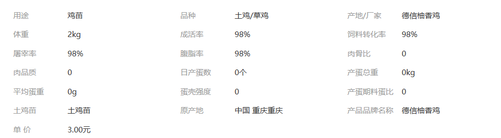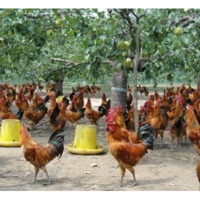 德信柚香土鸡体形呈三角形,腿细长,青脚,青嘴,羽黄以淡黄色为主。因其擅长野外散放,捕食青草,昆虫,因而体形适中,半年母鸡体重在1.5-1.7公斤左右,公鸡体形在1.8-2.5公斤。体形匀称,采食易低,半年鸡子采食量不超过9公斤,而且以原粮为主,除1月内用适量营养的全价饲料外不需其它任何饲料喂养。半年母鸡市场销价在16元/公斤以上。固始土鸡产蛋率较高,一般5个月开始产蛋,6-7个月进入高产期,平均产蛋率65%以上。德信土鸡蛋品质特别好,蛋壳颜色较淡。正常鸡蛋的重量在45克,蛋黄颜色深而大,蛋清稠且富含多种人体可需元素,氨基酸含量高出其它品种鸡蛋的许多倍,适口性好。德信土鸡蛋价位每枚在2元左右。