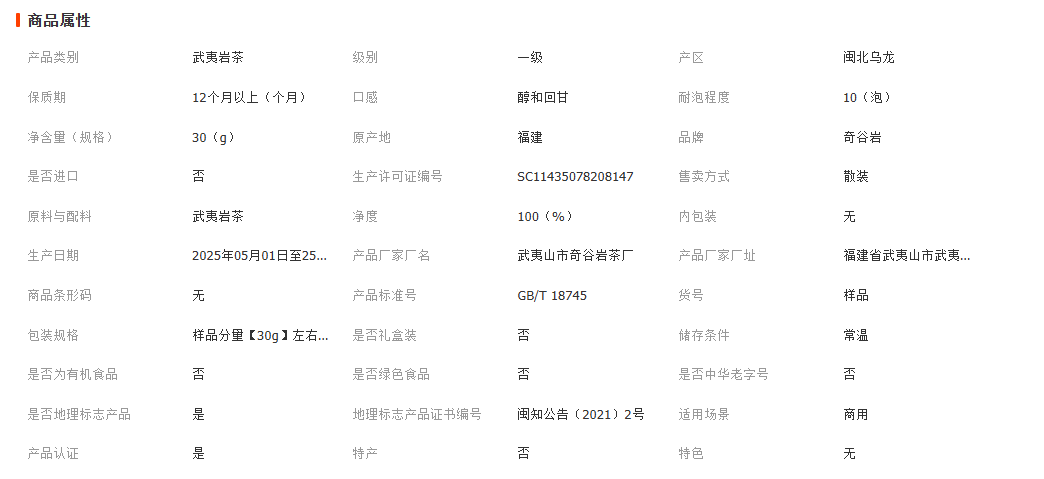 武夷山市奇谷岩茶厂发布的【茶叶样品】茶叶试喝 福建武夷山岩茶 乌龙茶 30g茶样水仙肉桂图集库