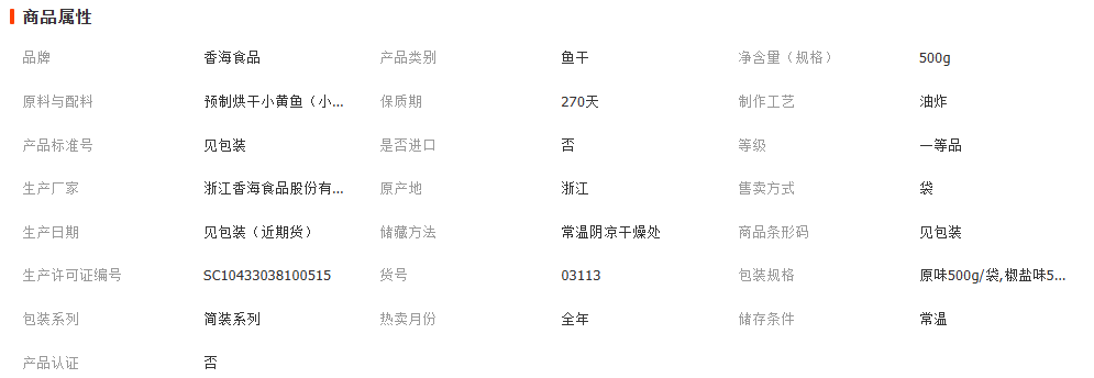 浙江香海食品股份有限公司发布的香海食品香酥小黄鱼干500g袋装即食烤干货解馋深海海味海鲜脆零食图集库