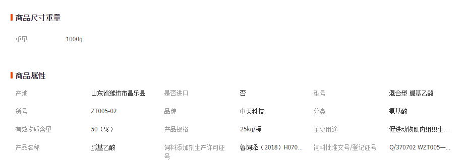 产品成分分析保证值(每千克含量):胍基乙酸,% ≥ 50