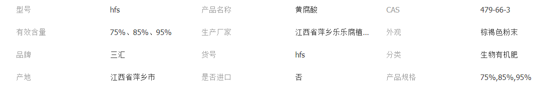 [成份]:黄腐酸是一种溶于水的棕黄色的粉末状物质。它是一种植物生长调节剂,能植物生长,对抗旱有重要作用,能提高植物抗逆能力。主要应用对象为小麦、玉米、红薯、谷子、水稻、棉花、花生油菜、烟草、蚕桑、瓜果、蔬菜。
