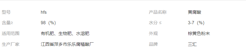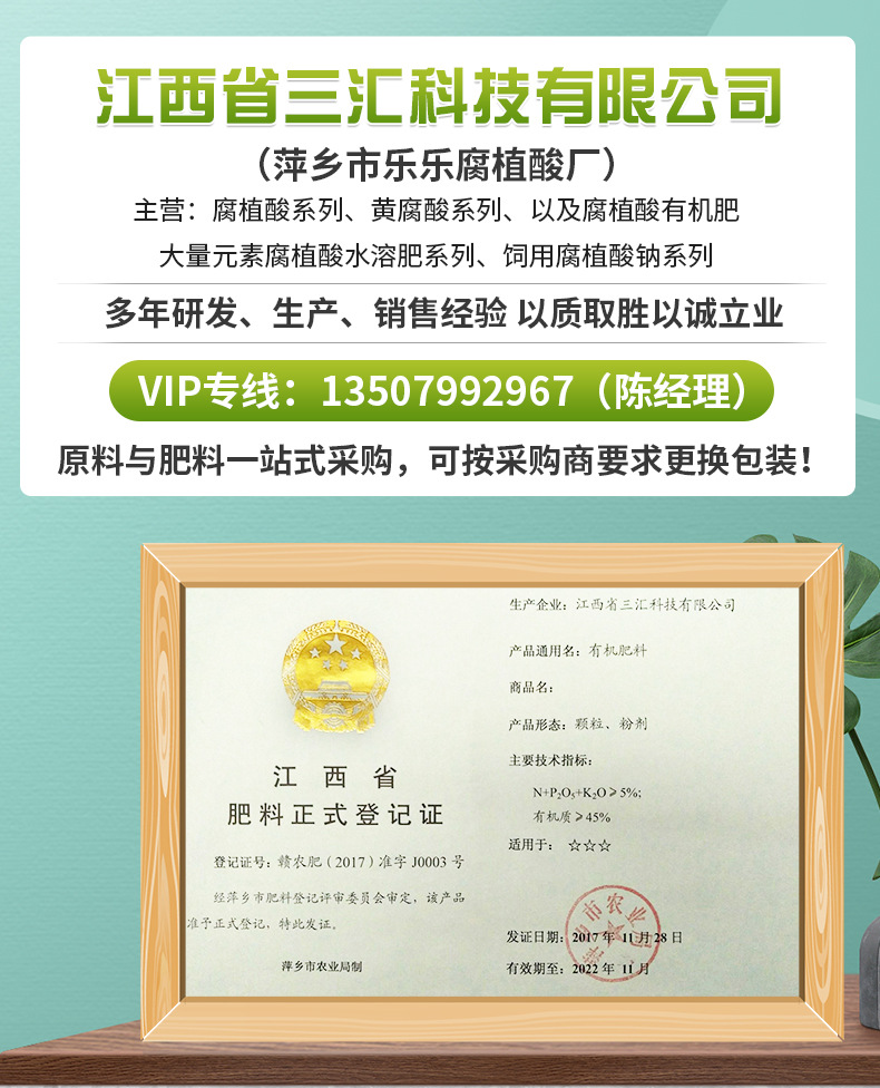[成份]:黄腐酸是一种溶于水的棕黄色的粉末状物质。它是一种植物生长调节剂,能植物生长,对抗旱有重要作用,能提高植物抗逆能力。主要应用对象为小麦、玉米、红薯、谷子、水稻、棉花、花生油菜、烟草、蚕桑、瓜果、蔬菜。