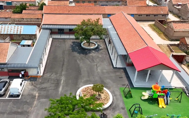 这是5月25日拍摄的五莲县许孟镇曹家屯刚刚建成的民生综合体(无人机照片)。曹家屯村民生综合体由第一书记张凯牵头推进落实,包括升级改造后的幸福食堂,以及村民活动室、爱心理发室、暖心洗衣房等,全面提升村庄公共服务水平。