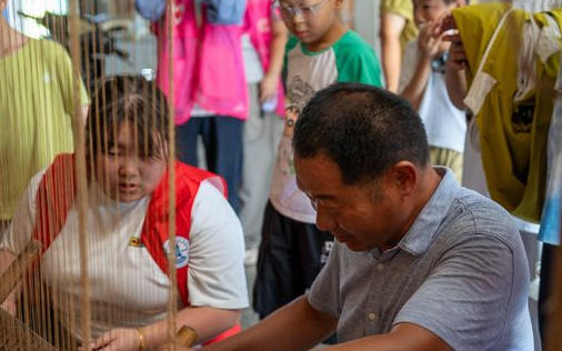 活动中,7名大学生与孩子们一起向草席编织非遗传承人学习技艺,从选草、晾晒,到编织手法、收边技巧,传承人手把手地教,学生们一丝不苟地学。经纬交错之间,不仅是技艺的传递,更是两代人情感的交流和文化的接力。住在村里的大学生张雪妍表示:“亲手触摸这些散发着清香的蔺草,感受指尖流淌的古老智慧,是一次深刻的文化洗礼和难忘的实践体验。”